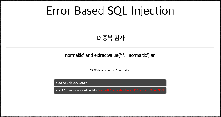extractvalue라는 함수를 이용하여 에러를 일으켜 원하는 문구의 오류 메시지를 띄워보는 작업을 진행해보았다. extractvalue는 첫 번째에 XML형식의 값을 두 번째 인자에 XPath조건식을 넣어 XML노드의 값을 반환하는 함수인데, 두 번째 인자에 유효하지 않는 표현식을 넣으면 에러가 발생하게 되는 원리이다.