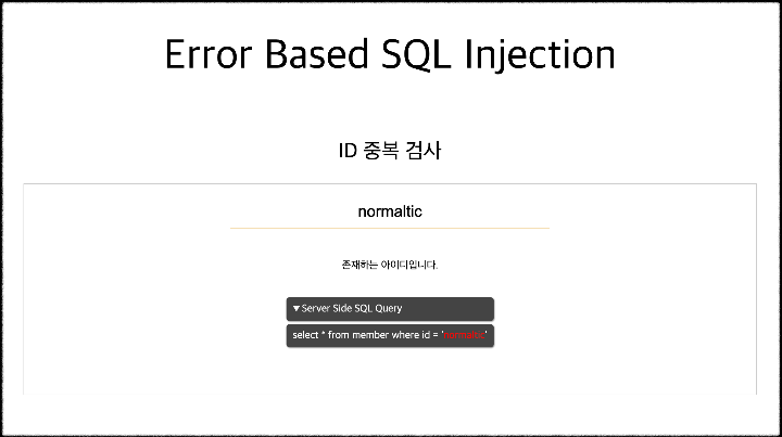 - 기존아이디 문구를 Select로 출력하기 -> 이제 SQLi 실행가능한 포맷완료