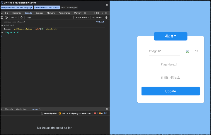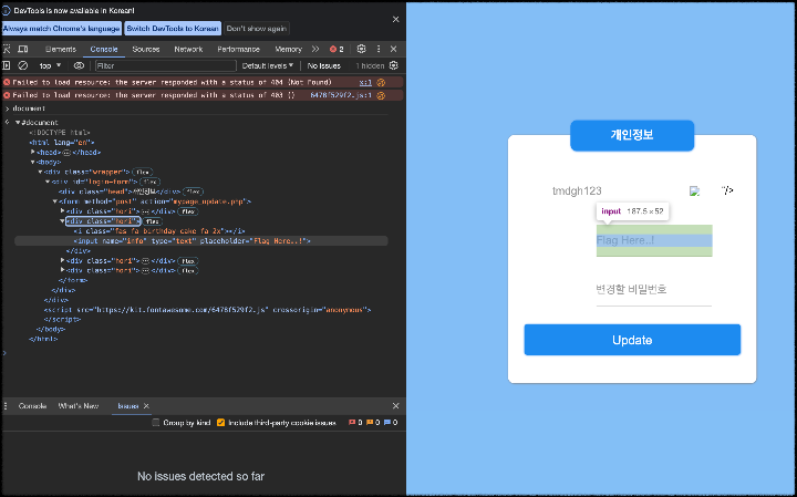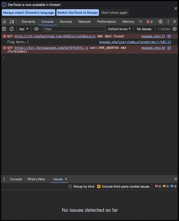 여기서 이제 먼저 URL창에 Eventhandler를 이용하여 스크립트문을 써서 콘솔창에 Flag Here..!이 띄워지는 것을 먼저 해보겠다.