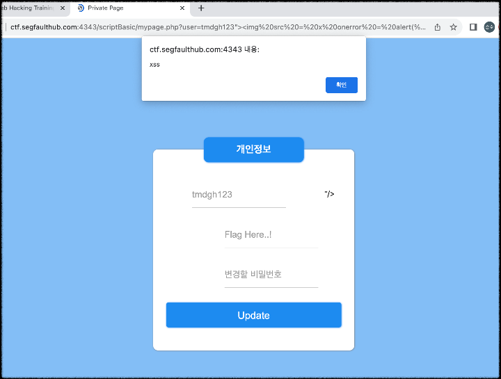 그러면 이제 취약점이 있는 마이페이지 URL창에 img태그를 이용하여 alert 경고창을 띄워보겠다.