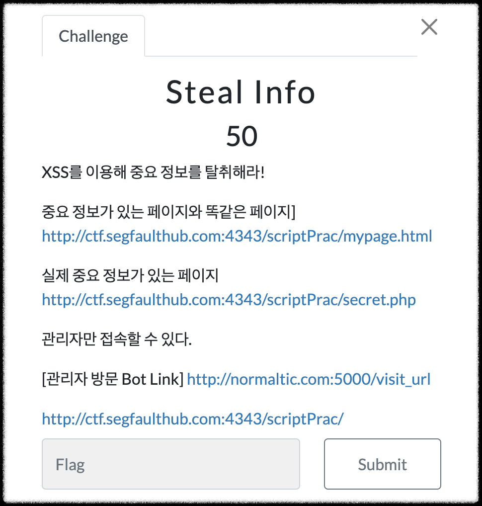 (1) iframe에 mypage.html이 아니라 실제 중요 정보가 있는 페이지가 있는 secret.php 문서의 주소를 입력해 주고 id=targetId라는 id값을 지정해 준다.