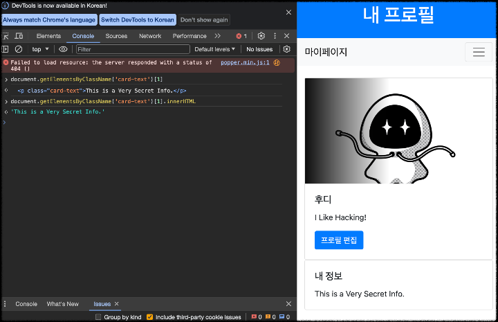 - 내 정보에 This is a Very Secret Info.라고 적혀 있는 것으로 보아 이 HTML문서에 저 글씨가 쓰여 있는 곳의 객체에 Flag가 숨겨져 있을 것으로 추측됨.