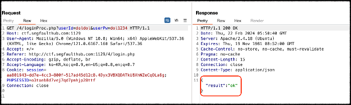 3) 이때 burp suite의 패킷을 살펴보자. 입력값을 받아서 인증이 제대로 되면 result로 ok를 응답해 주는 것을 볼 수 있다.
