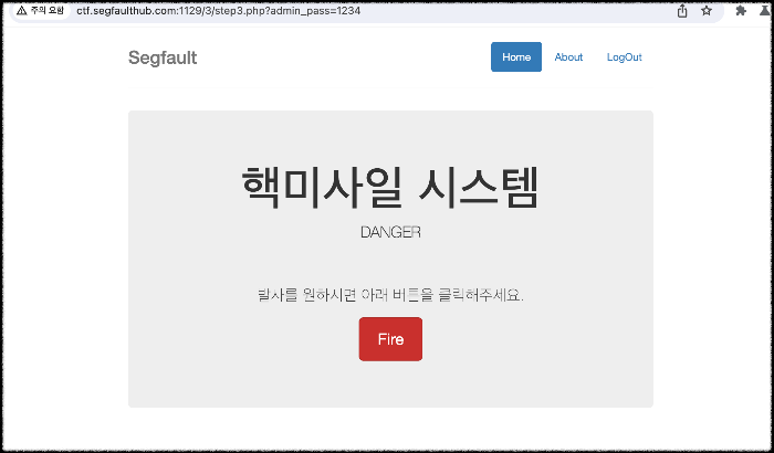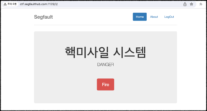 1) 처음 접속 화면에 핵미사일 시스템에 접근하여 Fire 버튼이 나온 것을 볼 수 있다.