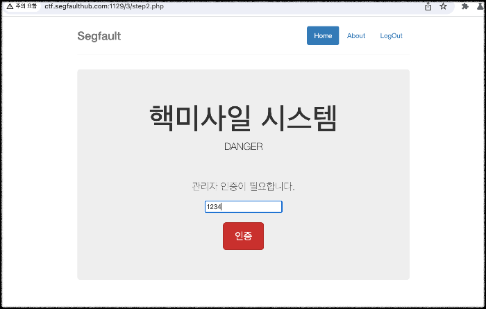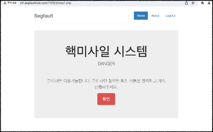 5) 근데 여기서 URL창을 보면 현재 단계를 보여주는 step2.php로 나온 것을 볼 수 있고 혹시나 하는 생각으로 URL에 step3.php를 입력하여 페이지에 직접 접근을 해봤다.!?! 인증 단계를 뛰어넘어 발사 버튼을 누를 수 있게 되었다. 버튼을 눌러보자.