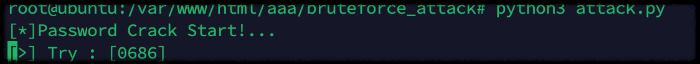 4) 본인의 웹 서버에서 파이썬 코드를 실행하여 비밀번호 검증을 시도하는 중인 화면이다. (현재 0686까지 진행 중이라 표시됨)