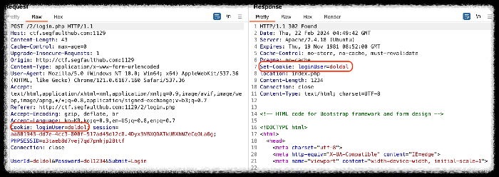 3) burp suite의 패킷을 보면 doldol로 접속을 하였을 때 클라이언트 요청 쪽에서 쿠키 값을 doldol로 요청하여 보냈고 응답 쪽의 쿠키 값을 doldol로 받아 처리한 것을 볼 수 있다.