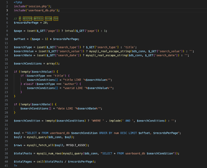 $sql 게시물을 가져오는 SQL 쿼리를 생성하고 검색 조건에 따라 WHERE 절이 추가되어 검색