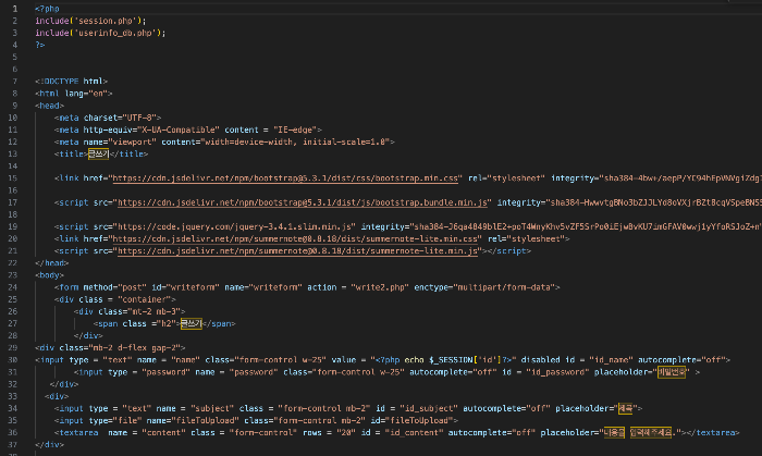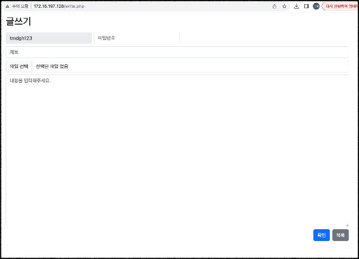 글쓰기 페이지는 스켈레톤 코드를 만들 때 제목, 내용, 비밀번호를 입력받고 확인을 눌렀을 때 userboad_db에 그대로 저장되는지 아이디는 세션으로 받아 disabled로 표시하고 db에 저장되는지 확인한다. 그리고 추후 파일 업로드 기능을 업데이트해줬는데 이미 웹 서버를 다 만들고 포스팅하는 거라 파일 업로드 기능이 있는 것을 볼 수 있겠다.