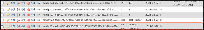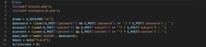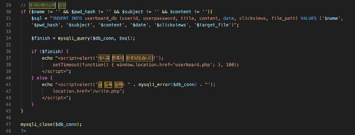 글쓴이는 세션 아이디로, 입력 값을 받은 것들은 isset 함수로 값이 있는지 확인, 비밀번호는 해시화 하여 저장, 그 외 날짜, 조회수를 변수로 지정한다.