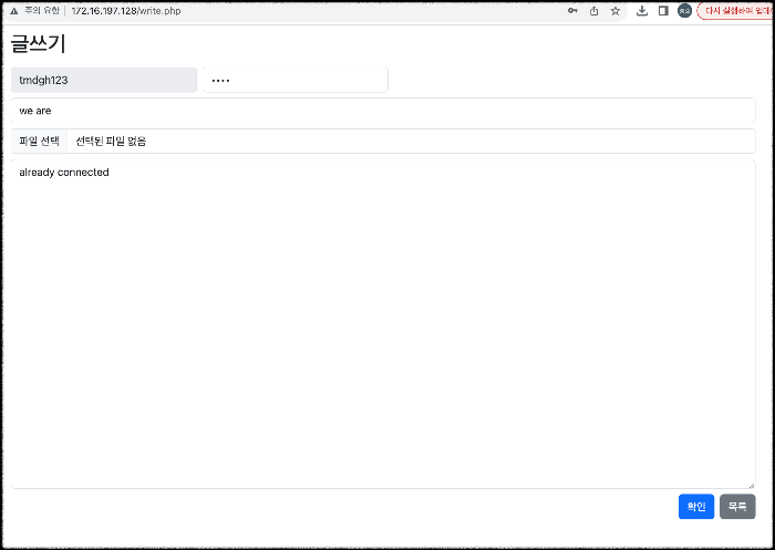 1) 비밀번호(userpassword가 아닌 게시글의 비밀번호), 제목, 내용을 입력 후 확인 버튼을 누른다.