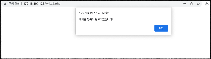 2) write2.php로 이동되면서 게시글 등록이 완료되었다는 알림 창이 뜬다.