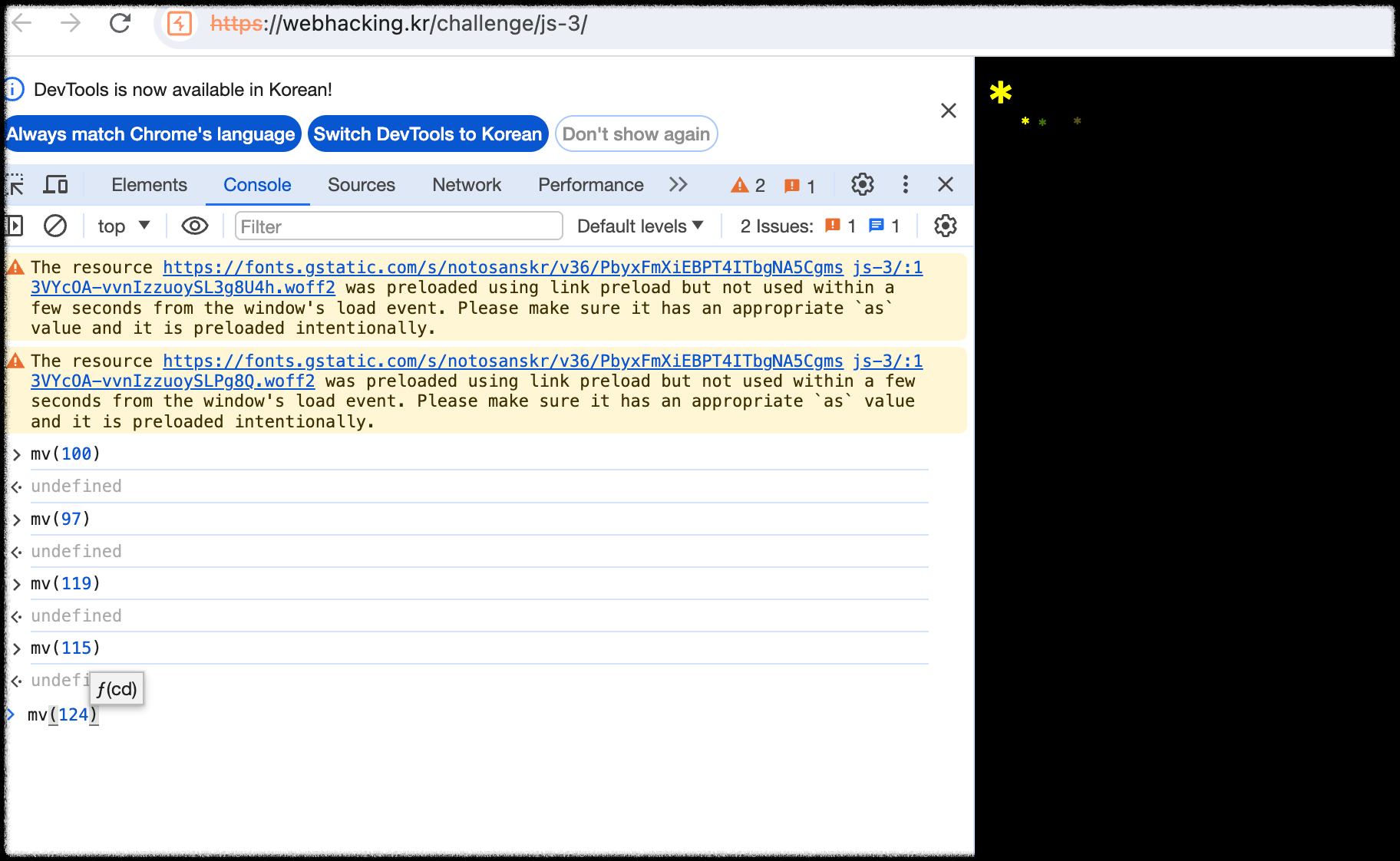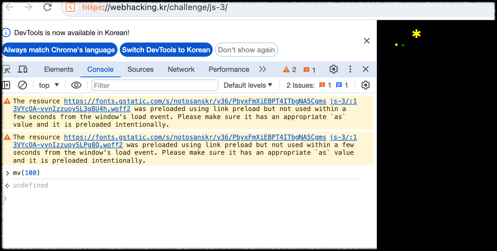 페이지 소스에 있는 cd 값을 다 넣어서 mv함수를 차례대로 입력하면 별이 이리저리 움직이면서 맨 오른쪽에 작은 별이 한 개 더 생긴다.