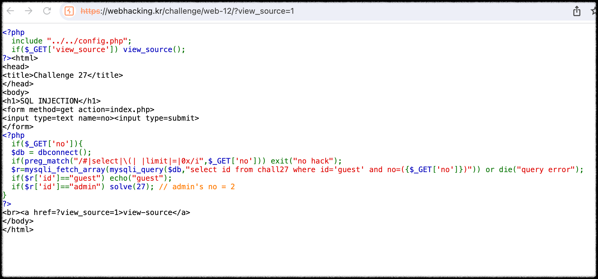 preg match 함수로 GET ['id']에 select, (, 공백, limit, =, 0x 가 들어오면 필터링하는 것을 볼 수 있다. 그리고 no hack이라는 단어가 출력.