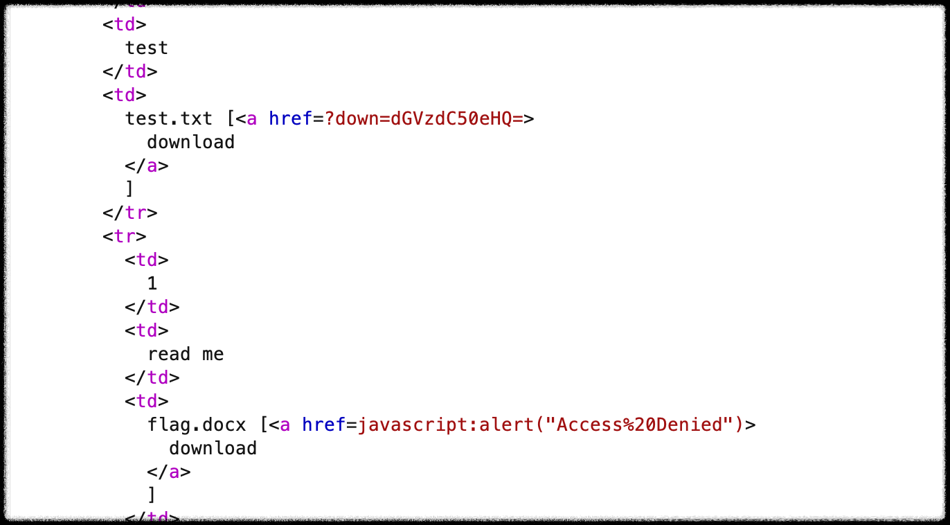 Burp Suite로 패킷을 가로채 보니 text.txt는 base64로 인코딩 된 주소로 이동해 파일을 다운로드하고 flag.docx는 자바스크립트로 경고 창을 띄우는 코드를 볼 수 있다.