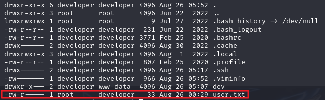 14. 여기서 /home/developer/user.txt를 출력해 보면 접근 권한이 없어 거부된다. ls -al로 자세히 보니 root 소유에 group은 developer로 나온다.
