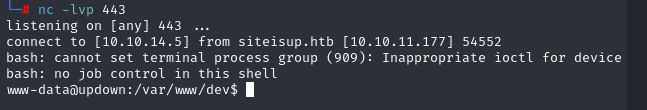 13. 로컬 pc에서는 443 포트를 열고 대기를 하고 있고 파일을 올리고 아까와 같이 웹 애플리케이션에서 접근을 하면 www-data로 접속 성공을 한다.
