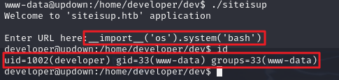 18. siteisup을 실행 후 Python의 __import__ 함수와 os 모듈을 사용하여 시스템 명령어를 실행할 수 있는 코드를 삽입한다. 그럼 사용자 계정이 developer로 바뀐 것을 볼 수 있다. 그러나 gid는 그대로 www-data 이므로 무엇인가 더 작업이 필요하다.