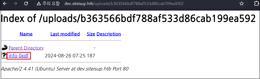 "dev.siteisup.htb/?page=phar://uploads/디렉터리이름(md5(time()))/info.0xdf/info"