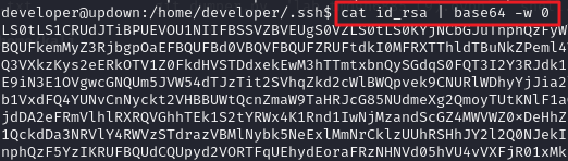 19. developer의 홈 디렉터리로 다시 돌아가서 .ssh 디렉터리를 보게 되면 ssh 접근을 위한 개인키가 rsa로 암호화되어있는 것을 확인할 수 있다. 이것을 base64 인코딩 후 출력 그리고 복사하여 로컬 pc에서 디코딩하여 ssh 접근을 시도해 보자.