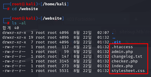 3. "python3 git_dumper.py http://siteisup.htb/dev/.git/ ./website" 결과 ./website 폴더에 php파일들이 존재했던 것을 볼 수 있고 .htaccess 파일 내용까지 볼 수 있다. (github에서 git_dumper.py 다운로드하기)