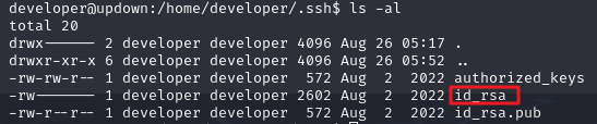 -> /home/developer/.ssh 접근하여 개인키 복사 후 로컬 PC에서 일반계정으로 ssh 접근