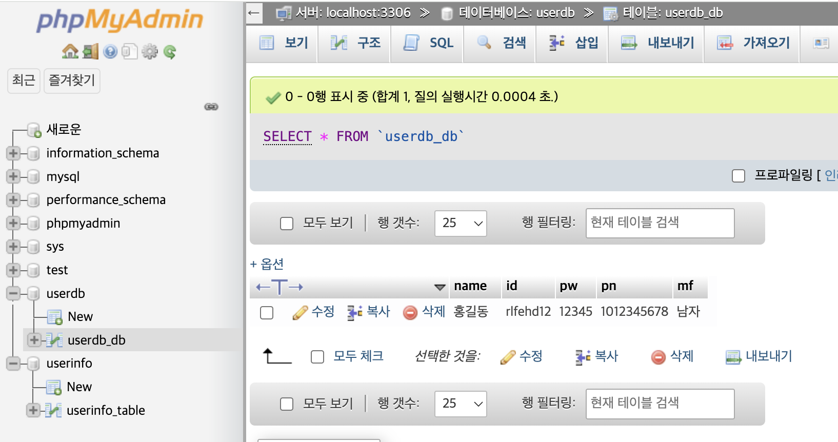 회원가입 완료 메시지가 떴으니 DB에서 정보가 잘 들어왔는지 확인해 보자.