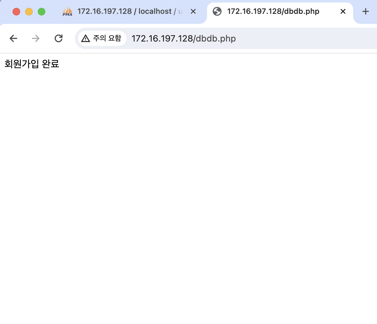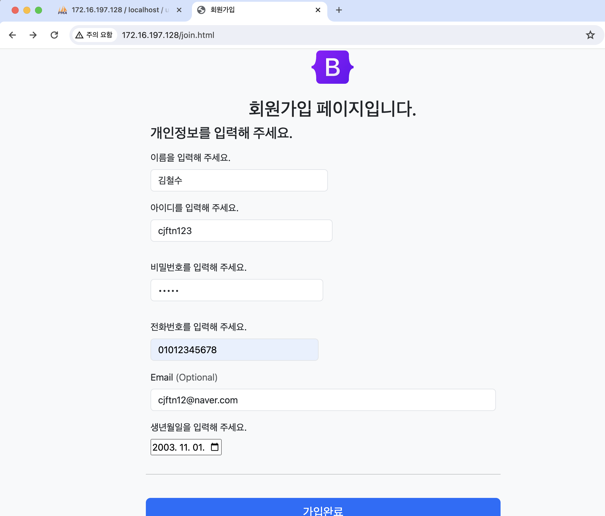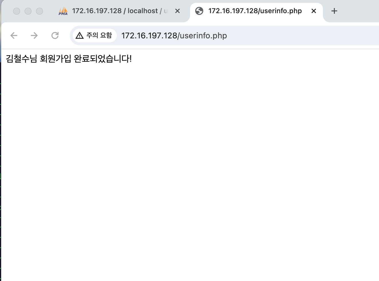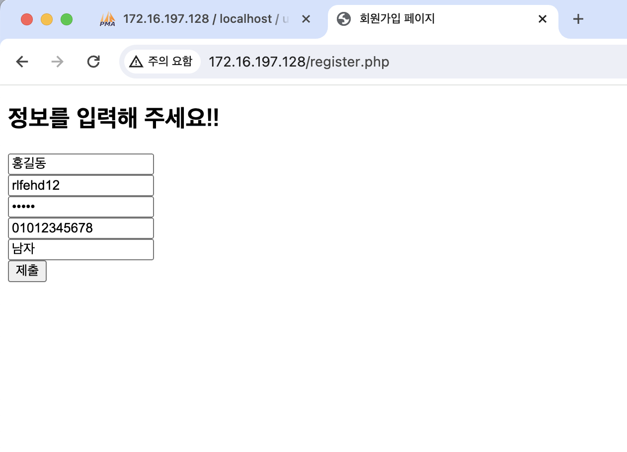 그리고 회원가입 정보입력 페이지에서 가입 완료버튼을 누르면 계속 오류 메시지가 떠서 한참 고생했는데 이거는 몇 시간을 찾아 헤매고 오류 찾으려고 echo 넣어가며 별 생쇼를 다했었고 원인은 변수이름 오타였다. 너무 허무했지만 db에 김철수라는 사람의 이름이 뜨는 것을 보고 왜 웃음이 나는지 허허허... 정말 단순하다. 오류도 그리고 나도