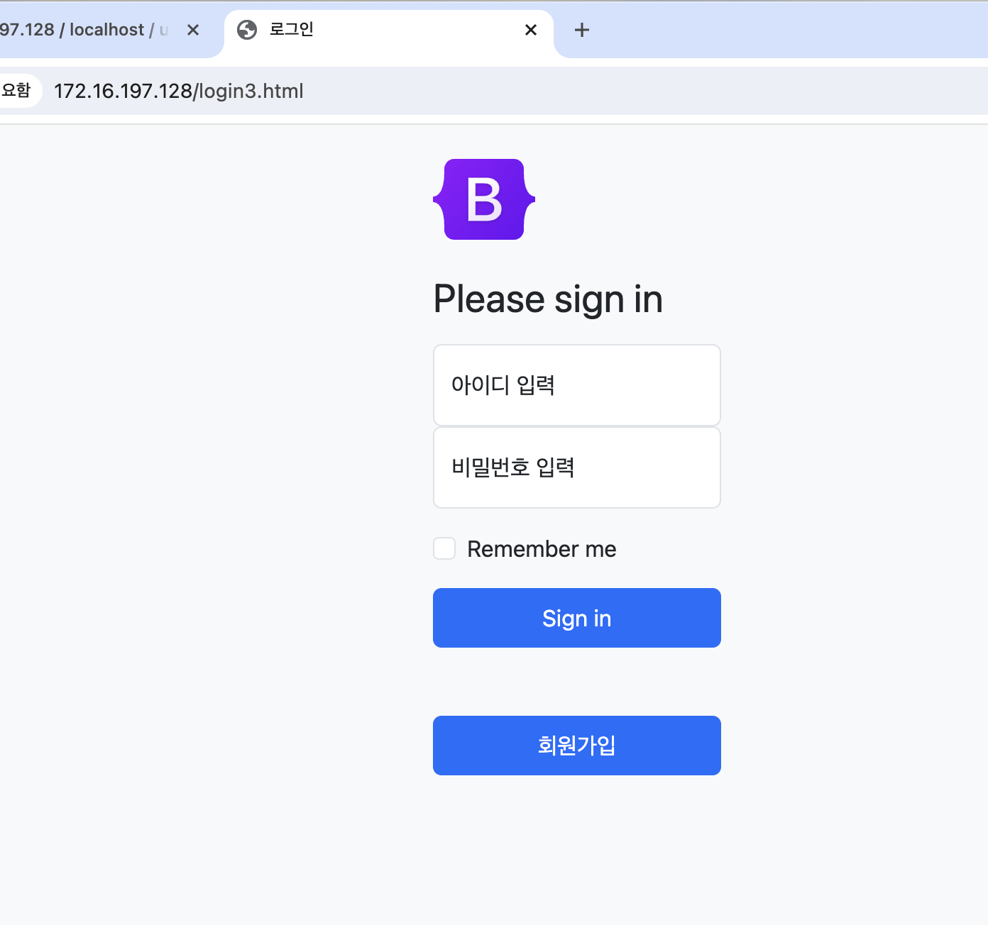 부트스트랩으로 회원가입 페이지를 만들고 DB연동하기를 우선 해봤는데 에러가 나고 막히는 부분이 있어서 우선 간단하게 만들고 꾸미기로 했다. (급할수록 돌아가라 라는 말이 통용되었다.)