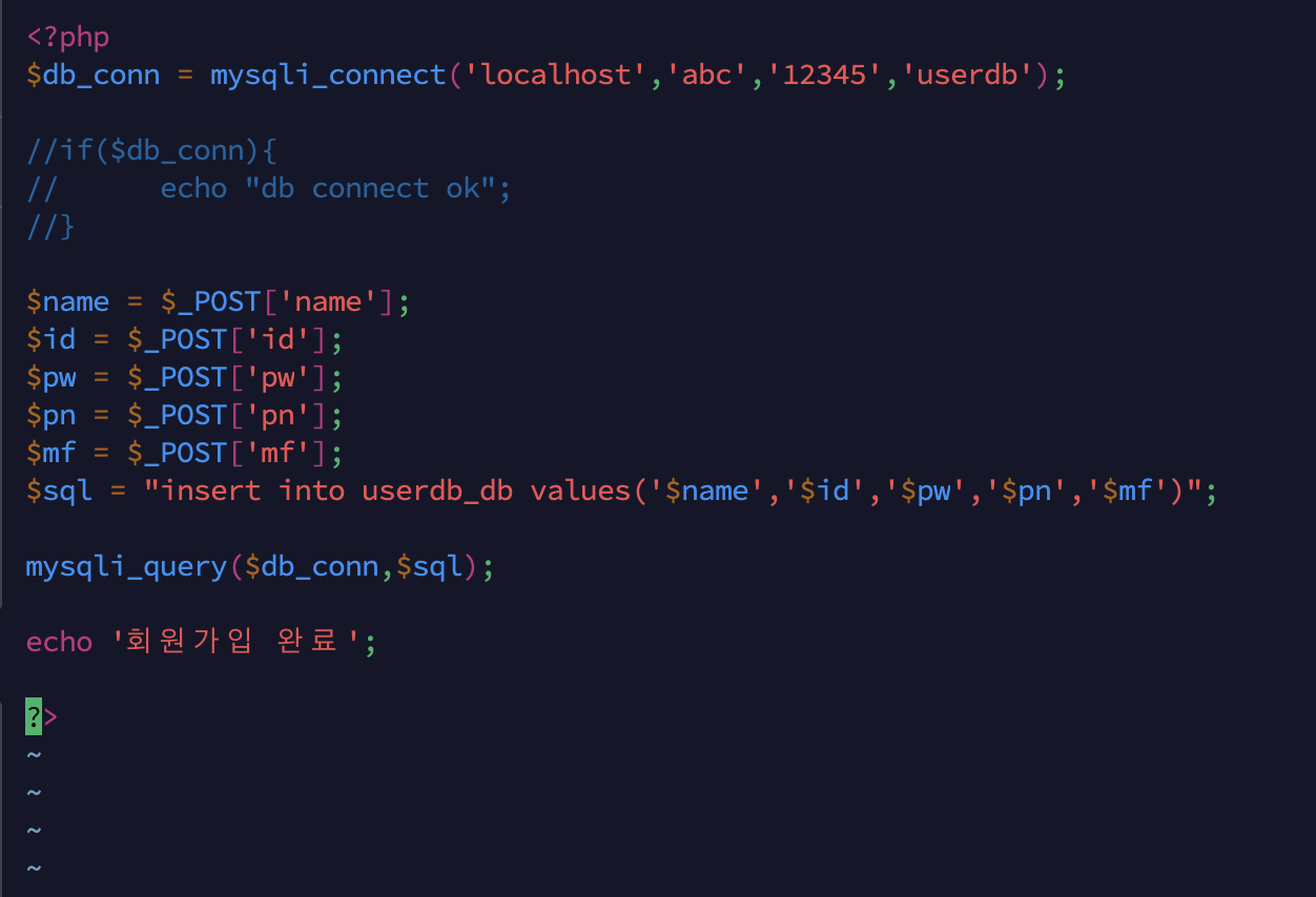 정보입력 받는 코드 1. 회원가입에서 받은 정보를 관리하기 위해 mysqli_connect 함수를 사용해 DB 연동 코드 작성