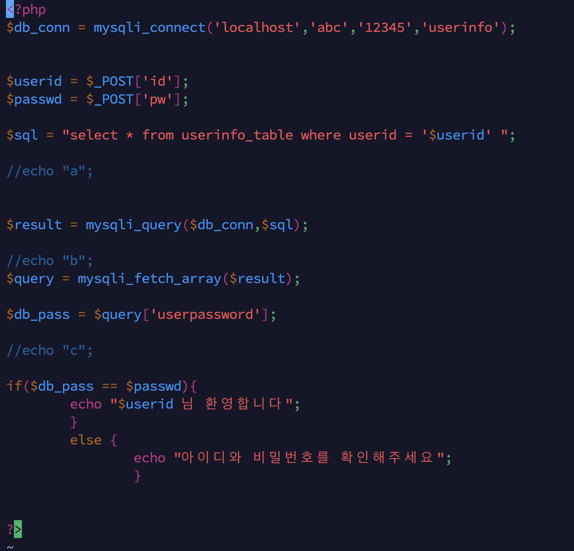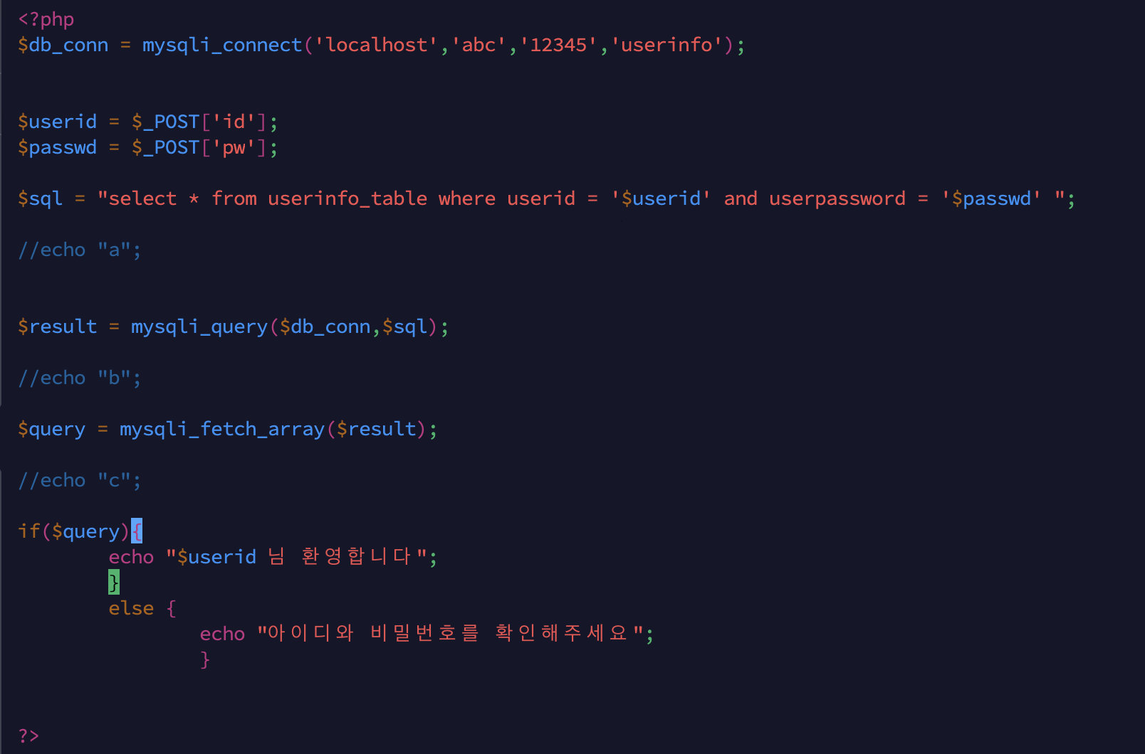 Select 문에서 아이디와 비밀번호를 동시에 가져와 인증하는 코드