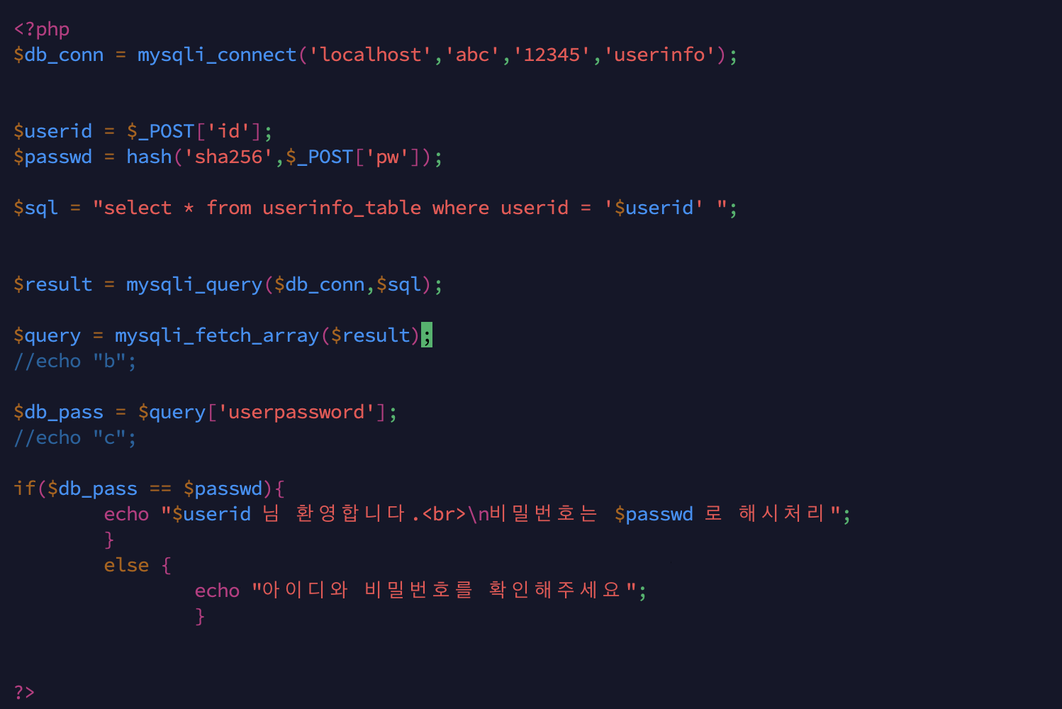 1번과 sql문은 같지만 비밀번호를 담은 변수에 hash함수로 둘러싸고 암호화 방식 (sha256 말고도 md5 등등 가능)을 적용한 코드