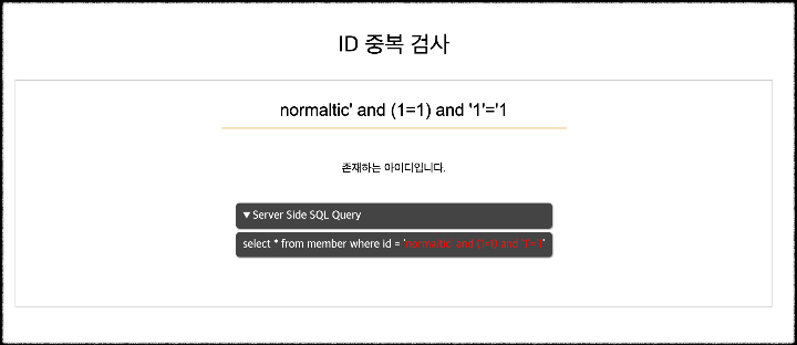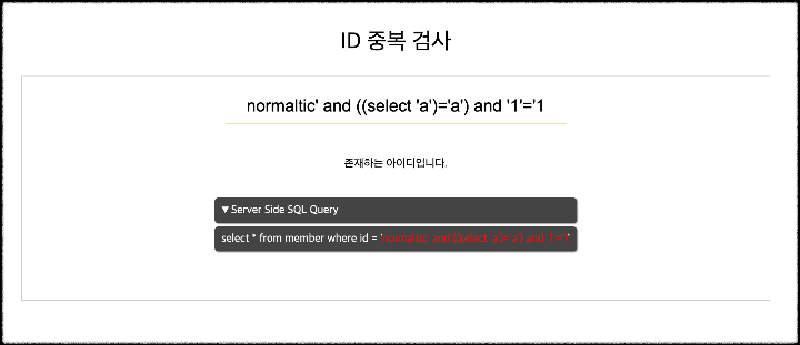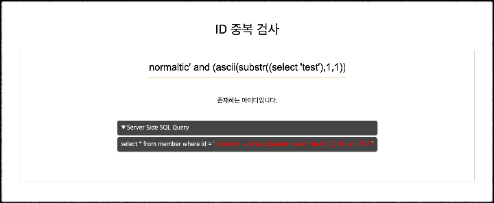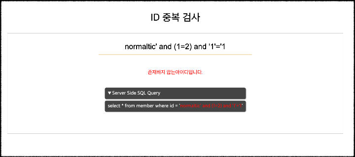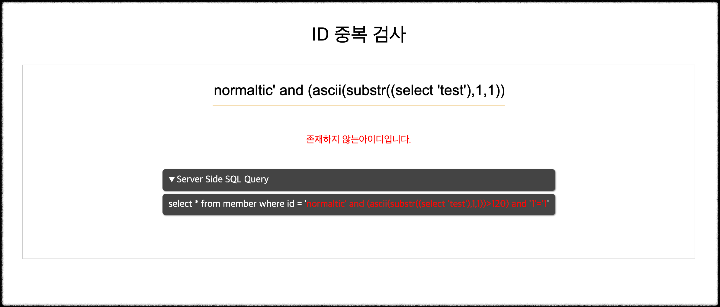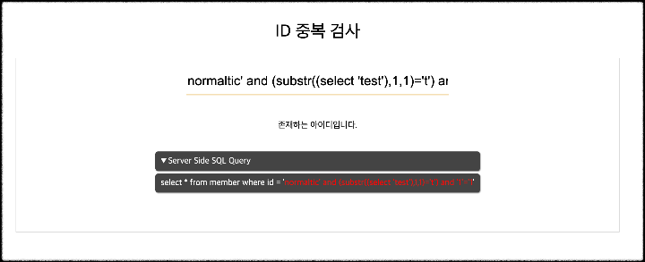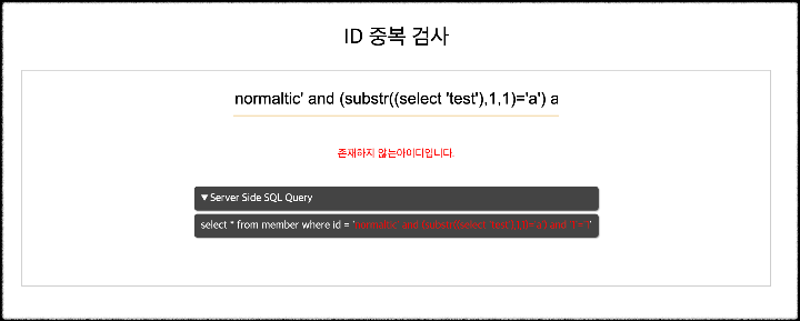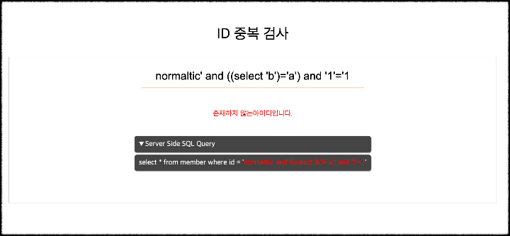 select로 글자를 다르게 하여 select 구문이 작동하는지 확인하는 과정이다. 이것도 참일 때는 존재하는 아이디로 거짓일 때는 존재하지 않는 아이디로 표시된다.