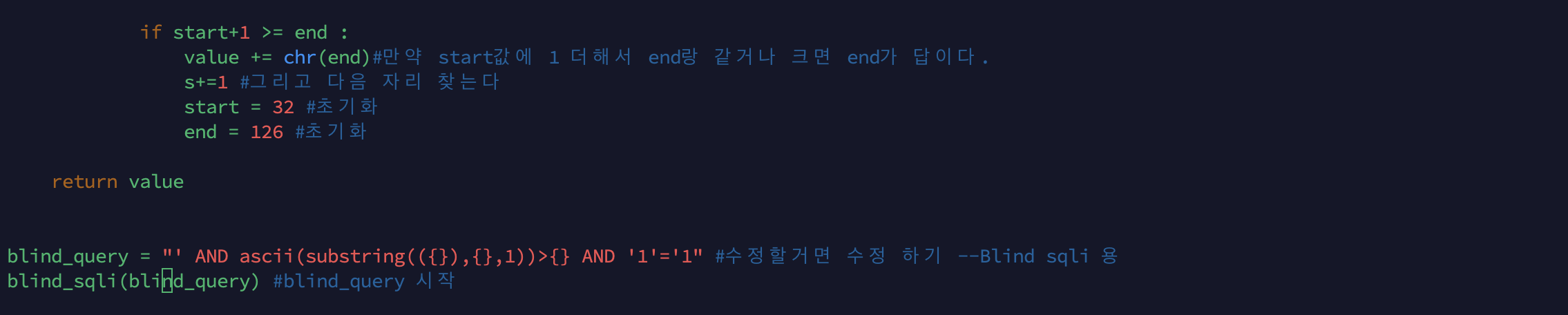 - blindsql_query 포맷에서 인자는 query, s , 0이 들어가고 query는 blind sqli 쿼리문, s는 첫 번째 글자부터 시작, 0은 ascii code에서 null 값을 의미 (0보다 크다는 것은 null 값이 아닌 것을 의미하고 글자가 있다는 의미이다. 마지막 글자가 없다면 종료 또는 시작 시 null인지 검증)