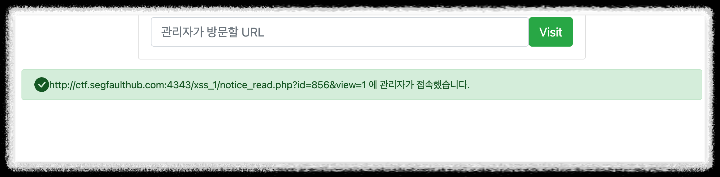 - 관리자 봇에게 악성코드가 저장된 게시물의 링크를 넣고 visit 버튼 누르기