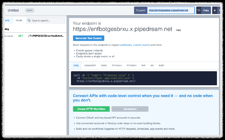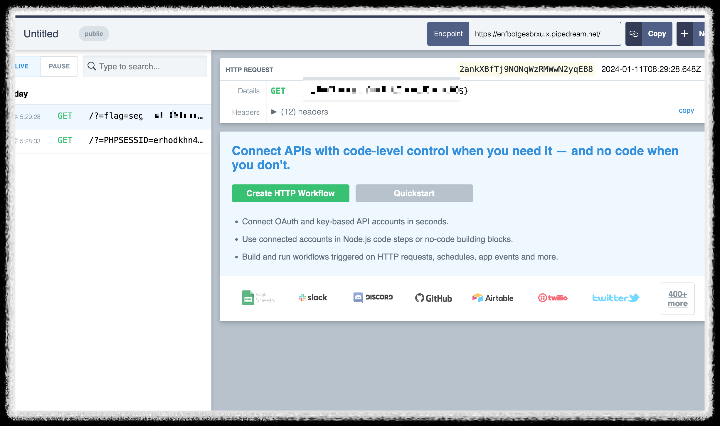 - 공격자서버[리퀘스트빈]에서 GET방식으로 쿠키값이 잘 전달된 모습 확인