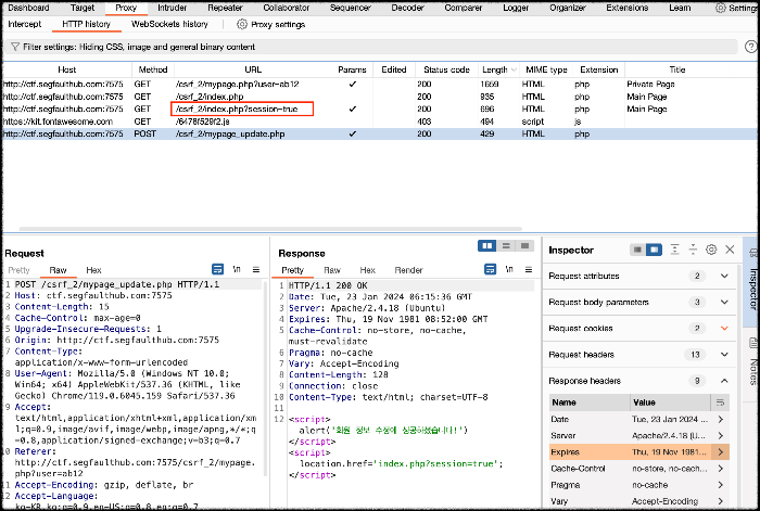 3) 프록시에서 패킷을 확인할 시 session=true라는 세션검증을 하는 단계가 보임