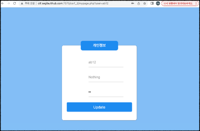 1) 마이페이지에서 변경할 새로운 비밀번호를 넣고 Update 버튼을 누른다.