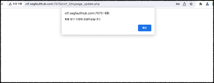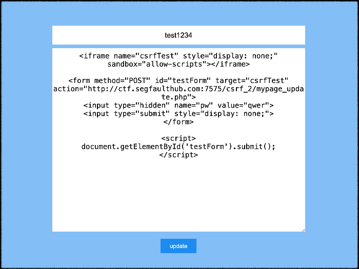 - 회원 정보가 수정되었다는 알림을 띄우면 관리자가 눈치챌 수 있으니 iframe의 sandbox 속성을 allow-scripts로 넣어주어 알림창이 뜨지 않게 만든다.