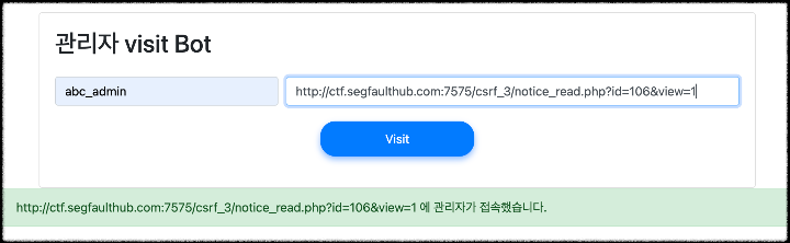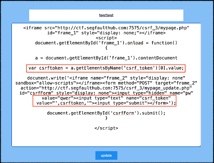 이번 문제는 CSRF 토큰이 추가되어 토큰 인증 방식을 우회하여 관리자의 비밀번호를 바꾸게 하는 CSRF 공격을 할 것이다. 지난 번과 마찬가지로 POST 방식을 사용하여 코드를 만들 것이고 XSS 취약점이 있는 게시판에 저장하여 게시물 링크를 보낼 계획이다.