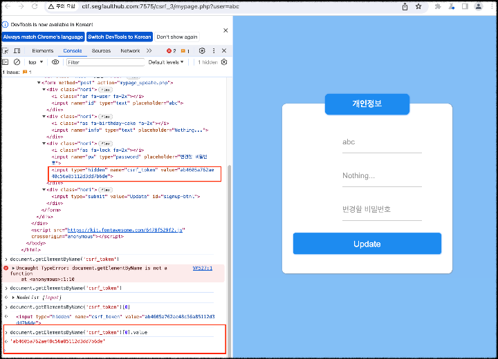 4) reponse의 input 태그에 토큰을 생성한 것을 확인하고 개발자 도구의 콘솔창에서 혹시나 하고 확인해보니 HTML 객체에 토큰값이 생성된 것을 볼 수 있다.