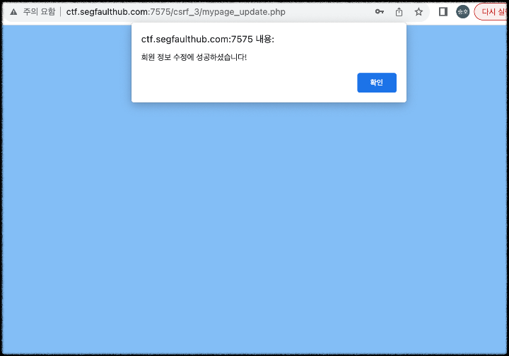2) 회원 정보 수정에 성공했다는 알림 창이 뜨면서 이번엔 로그인 페이지가 아닌 로그인 된 상태의 메인페이지(index.php) 로 이동하게 된다.