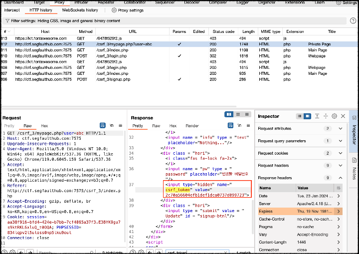 처음 mypage에 접근시 response에서 랜덤한 값의 csrf토큰을 생성하고 update 버튼을 눌러 비밀번호를 변경 시도하면 requset에서 파라미터 값으로 request에서 받았던 값 그대로 붙여 요청하게 된다.