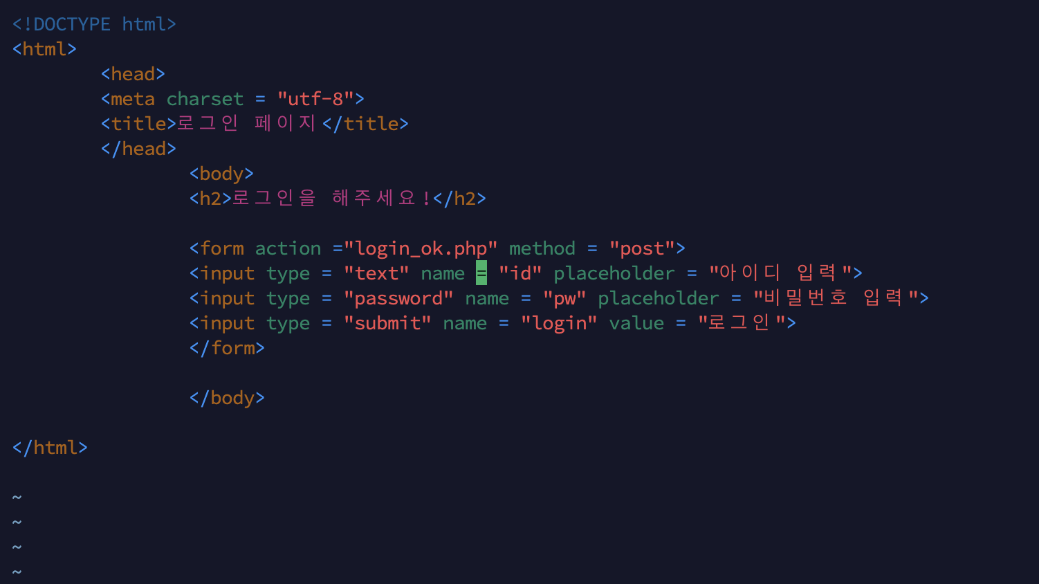 아이디와 비밀번호를 처리하는 거라 POST 방식으로 썼고 submit은 입력된 정보를 서버로 보내는 것. 그리고 입력된 정보를 login_ok.php 로 보내는 action 속성을 적용했다.